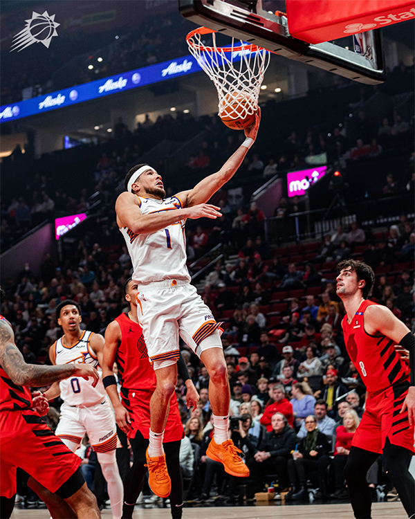 下半场,太阳第三节被开拓者6-0追平比分,杜兰特中投止血,布克罚球得分,布克中投以及轰进三分,开拓者立即回应三分,两队疯狂对攻,打着打着太阳断电,开拓者一波攻势夺回主动权;太阳单节25-37净输12分,三节打完落后6分,布克单节11分并且正式加冕太阳队史得分王。