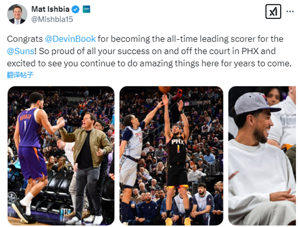 太阳老板伊什比亚发推祝贺布克:恭喜布克成为队史得分王,为你在场上场下取得的所有成功感到骄傲,也希望未来你继续在这里取得惊人的成就。