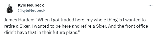 在谈到目前与球队之间的情况时,哈登说道:“当初我被交易到这里时,我一心只想以76人球员的身份退役。我本想留在这里并以76人球员身份退役。而管理层的未来计划里,没有这一点。但他在这方面非常非常擅长。