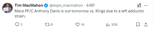来源:JRS直播网02-10 12:45JRS直播网讯 北京时间2月10日,独行侠球星安东尼-戴维斯的伤情出炉,独行侠官方表示,浓眉因左内收肌拉伤将缺席明天与国王的比赛,恐因伤缺席全明星正赛。