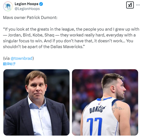 今日独行侠现任老板帕特里克-杜蒙特就球队交易东契奇事件首次做出评论,杜蒙表示:“如果你看看联盟中的伟大球员,看看那些和我一起长大的那些人——乔丹、伯德、魔术师、科比、奥尼尔——他们每天都非常努力,一心一意地想要赢得胜利。如果你没有这些,那就行不通了……如果你没有这些,那你就不应该成为达拉斯独行侠队的一员。