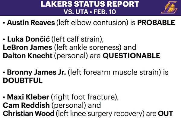 里夫斯(左手肘挫伤)大概率出战,75%出战可能性;东契奇(左小腿拉伤)、詹姆斯(左脚踝酸痛)和克内克特(个人原因)出战成疑,50%出战可能性;布朗尼(左前臂肌肉拉伤)大概率缺战,雷迪什(个人原因)、克莱伯(右脚骨折)、伍德(左膝手术恢复)继续缺席比赛。