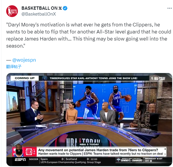 ESPN名记woj在节目中表示,76人总经理的动机就是不管他(用哈登)从快船队换回什么筹码,他都要将这些筹码转换成另一位全明星级别的后卫,用他来取代哈登在76人的位置,交易谈判在本赛季可能会进展缓慢。