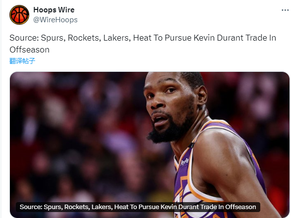 此前名记Brian Windhorst报道称,杜兰特今夏可能被太阳交易,名记shams报道,太阳和杜兰特将在休赛期就后者未来进行艰难的对话。