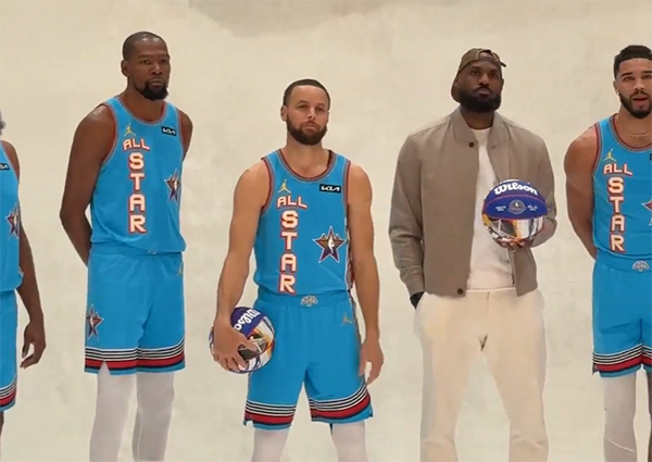 奥尼尔战队合影时,欧文、哈登、杜兰特、库里、詹姆斯、塔图姆、杰伦-布朗和利拉德依次站着,詹姆斯和库里抱着篮球位居C位凸显联盟地位,库里是今年全明星的东道主,40岁詹姆斯仍旧是联盟人气最高的门面;只有詹姆斯身穿便装合影,由于脚踝和足部不适,詹姆斯宣布退出全明星正赛。