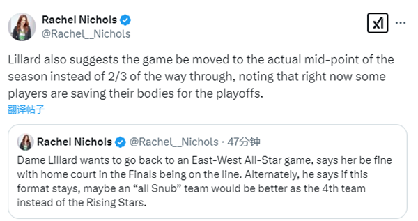 利拉德还提议,如果保留现有赛制,或许可以用一支“全遗珠阵容”(由未能入选全明星的球员组成)作为第四支球队,而不是新秀赛的球员。