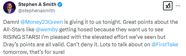 对于今年的全明星,追梦格林表示:这对文班亚马来说太不公平了,他只是认真对待这场比赛,他们没有机会追逐全明星得分纪录,他们努力了一整年才成为全明星,但你只打了40分的比赛就滚蛋了,这太不公平了。