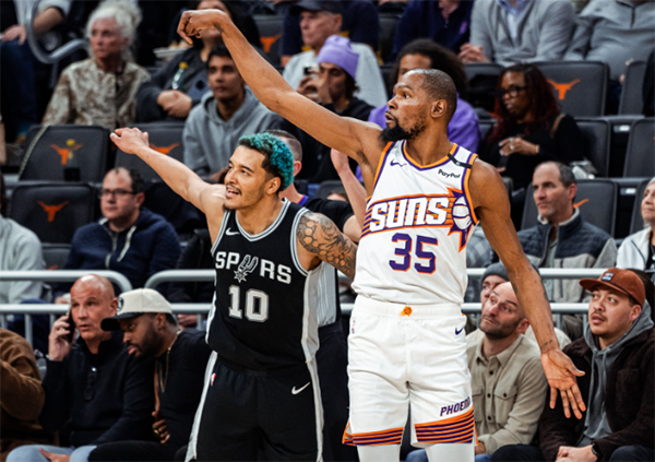 面对缺少文班亚马(遭遇右肩深静脉血栓,因伤赛季报销)的马刺,杜兰特和布克带队首发出战,太阳开场不顺而且第一节一直被马刺压制,首节21-31落后10分;第二节太阳找回准星,在落后两位数的情况下反扑追分,不过半场打完太阳54-60仍落后6分。