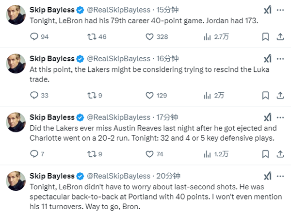 名嘴Skip连续发推写道:在40岁、生涯第22赛季的时候,勒布朗-詹姆斯在背靠背第二战面对开拓者的末节接管了比赛。干得好,国王。现在把这场胜利带回家吧。
