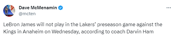 上一场湖人在赌城险胜篮网,詹姆斯身穿湖人23号球衣出战,只打了上半场,出战17分钟,投篮8中3,其中三分球4中1,罚球4中3,拿到10分3篮板5助攻1抢断1盖帽的数据,正负值+2;此前詹姆斯缺席湖人和勇士的比赛,下一场对阵国王,詹姆斯将再次缺席,这意味着剩余的三场季前赛(下一场对阵国王除外),詹姆斯至少会打2场。