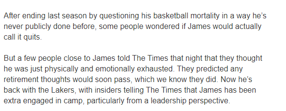 上赛季湖人在西决被掘金横扫后,詹姆斯曾考虑退役引热议,如今名记揭秘内情;据《洛杉矶时报》记者Don Woike撰文报道,几名詹姆斯身边的人士透露,那天晚上他们认为詹姆斯只是身心俱惫,他们估计詹姆斯退役的念头会很快褪去,而事实正是如此。