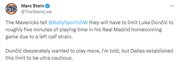 据名记Marc Stein报道:由于左小腿拉伤,独行侠将本场东契奇的上场时间限制在大约五分钟。据我所知,东契奇非常想打更多比赛,但独行侠保持着非常谨慎的态度。”