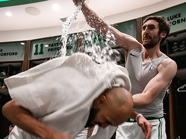赛后绿军更衣室疯狂泼水庆祝,塔图姆尽情泼水,怀特和普里查德浑身都被浇透,甚至有人把鞋扔过来。