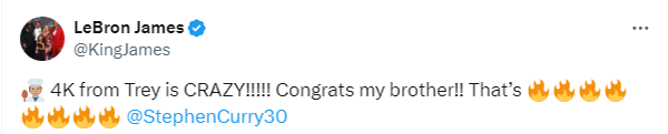 詹姆斯发推祝贺库里:大厨4000个三分也太疯狂了!!!!恭喜我的兄弟!!太炸裂了!