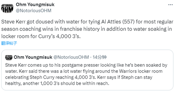 这一场科尔也迎来里程碑,勇士生涯执教胜场追平艾尔-阿特尔斯并列勇士队史第一,这是科尔被泼水庆祝的原因。