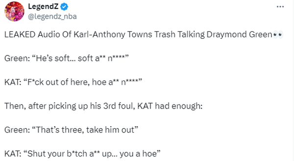 追梦逼迫唐斯失误后,追梦嘲讽道:他太软了,他就是个软蛋;唐斯回击道:你个婊子,赶紧滚蛋。