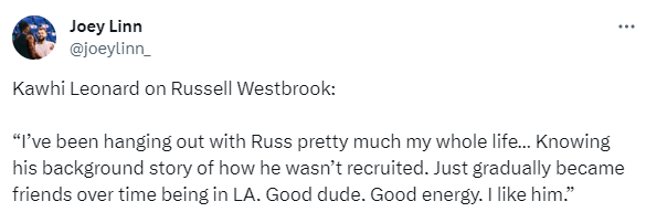 今天接受采访时,小卡仍旧面带笑容,谈到威少时,小卡表示:我从小就和威少相熟,知道很多有关他的事,随着我们在洛杉矶相处的时间越来越长,我们逐渐成为了好朋友。他是一个很棒的家伙,拥有非常好的能量,我喜欢他。