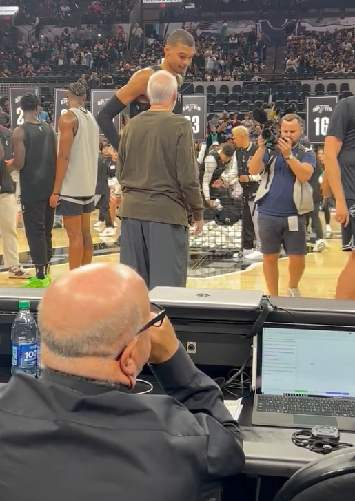 下半场,文班亚马第三节空接扣篮,不过黑队已经逐渐被银队反超,最终比分定格在65-74,文班亚马所在的黑队输了;赛后文班亚马和波波维奇热聊。