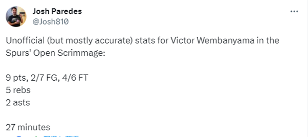 通过这一场马刺公开赛,文班亚马展示自己的天赋,人气爆棚早已成为马刺新宠,根据赛程,马刺将于10与10日在首场季前赛对阵雷霆,究竟文班能在NBA首秀的比赛中打出怎样的表现?拭目以待吧。