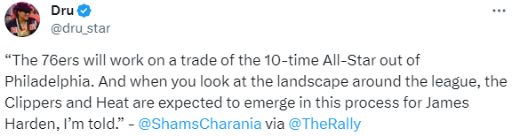 名记Shams节目中谈到了哈登交易的情况,表示:76人将致力于将这位10届全明星球员(哈登)交易走。当你看看目前联盟的格局时,我被告知,快船和热火有望在哈登的交易过程中脱颖而出