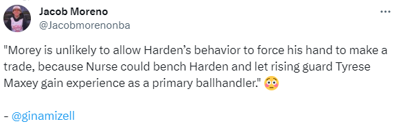 Gina Mizell透露,76人总经理不太可能因哈登的逼宫行为而被迫完成交易,因为纳斯可以让哈登坐在替补席,让后起之秀马克西担任球队的主要控球手。