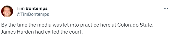 哈登已经来到科罗拉多州并且归队参加了训练——哈登身穿76人队训练服,先是在场边观战,之后加入训练参加合练。