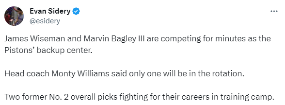 NBA两大榜眼沦落!怀斯曼和巴格利争夺替补中锋 仅1人能进入轮换