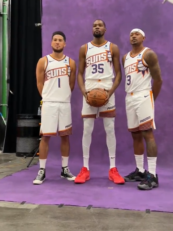 太阳新三巨头正式亮相,杜兰特身穿35号、布克身穿1号和比尔身穿3号,他们一起合影,杜兰特双手抱球站在C位,究竟谁是太阳队老大?答案都在合影之中了。