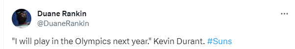 杜兰特和布克都承诺愿为美国男篮出战巴黎奥运会。布克接受采访时表示,他计划参加2024年巴黎奥运会。在被问及是否会招募杜兰特一同参加时,布克表示:如果他愿意的话。我认为我们会一起去的。
