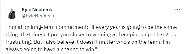 谈到哈登缺席媒体日,恩比德表示:如果每年都是同样的事情,每年都无法更接近总冠军,这会让人感到沮丧。球队里有谁并不重要,我始终相信我们有机会获胜。我爱费城,我的整个职业生涯都在这里。如果我们要赢得冠军,那将是为了这座城市和球迷。