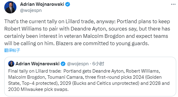 名记woj列出开拓者用利拉德换来的全部资产,得到艾顿、布罗格登、罗伯特-威廉姆斯、卡马拉、2024年勇士的首轮签(前四受保护)、2028年雄鹿选秀权互换、2029年雄鹿无保护首轮签、2029年凯尔特人无保护首轮签和2030年雄鹿选秀权互换;还得到280万美元交易特例(在霍勒迪交易中得到)和880万美元的交易特例(在利拉德三方交易中得到)。