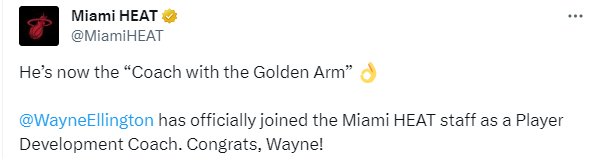 热火阵中迎回了一位老熟人,35岁的韦恩-艾灵顿正式加入了斯波尔斯特拉的教练组,担任球员发展教练;换言之,艾灵顿不打球了,换个身份继续留在NBA。