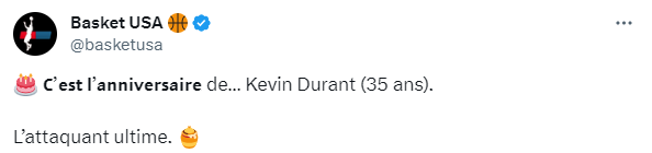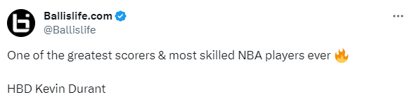 美媒也祝贺杜兰特生日快乐,Ballislife表示NBA历史上最伟大的得分手和最有技巧的球员之一,KD生快;Basket USA表示杜兰特是终结者。