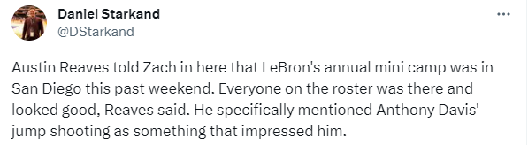 除了经常凌晨起床苦练之外,詹姆斯已经举办了迷你训练营,号召众队友一起合练备战新赛季,据湖人新星里夫斯透露,湖人全队所有球员都参加了,浓眉的投篮表现令人印象深刻,里夫斯希望浓眉能够投更多的三分球。