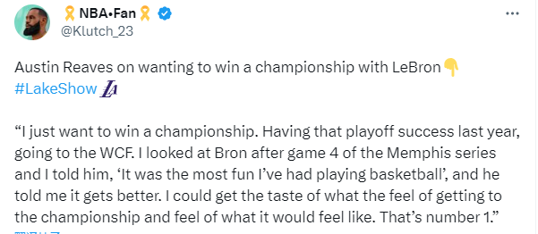 里夫斯还表示他想和詹姆斯一起夺冠,表示:我只想赢得总冠军。去年季后赛取得成功后,进入了 西部半决赛与灰熊G4赛后,我看着勒布朗,我告诉他,‘这是我打篮球以来最有趣的一场比赛’,他告诉我情况会变得更好,我可以尝到获得总冠军的感觉,感受到它会是什么样子。这是第一。