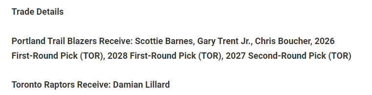 猛龙把斯科特-巴恩斯、小特伦特、布歇、2026年首轮签、2028年首轮签和2027年次轮签送到开拓者,得到利拉德。