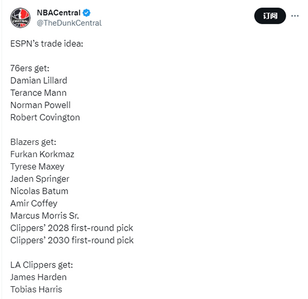 来源:JRS直播网09-26 10:05JRS直播网09月26日讯 ,美媒ESPN列76人、开拓者和快船三方交易方案,涉及12名球员和2个首轮签,相当于涉及14名球员,通过这样的交易,76人4换4打造利拉德+恩比德组合,快船则是9换2得到哈登,登哥联手小卡和乔治冲冠。