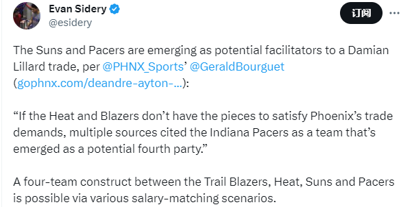 据报道,太阳和步行者已经成为利拉德交易的潜在推动者:如果热火队和开拓者队没有足够的能力来满足太阳队的交易要求,印第安纳步行者队将成为潜在的第四方。
