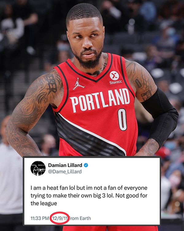 利拉德早已把热火视为自己心目中最心仪的下家,不过利拉德昔日言论被挖坟,有球迷挖出了利拉德2012年的一条推特,当时利拉德发推写道:我是一名热火球迷,但是我不喜欢每支球队都去组建自己的三巨头,这样对联盟不好。
