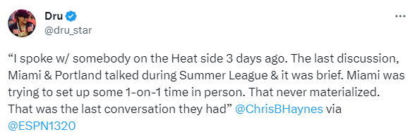 ChrisHaynes报道,波特兰目前拒绝和热火谈判,而热火也明白他们没有足够的资产,但他们想知道,‘嘿,波特兰,我们会拉第三或第四队加入交易,但请与我们沟通并让我们知道你想要什么’。三天前我和热火内部人士谈过,他们与开拓者最后一次交流还是在夏季联赛期间,很简短,迈阿密想安排一次一对一的单独会面,但这从未实现,那是他们最后一次谈话。