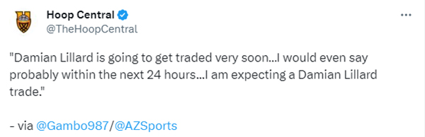 太阳随队记者John Gambadoro在节目中表示:达米安-利拉德很快就会被交易,预计利拉德交易即将达成,迫在眉睫了,我甚至会说这交易会在24小时内发生,据我所知,预计利拉德交易会达成的。
