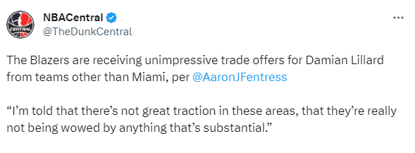 开拓者记者Aaron J. Fentress报道,开拓者近期还未与热火就利拉德交易进行谈判,开拓者管理层近期正在与其他球队进行谈判,尝试寻找另一份报价,不过目前所有的报价对于开拓者来说都没有太大吸引力,开拓者管理层目前没有被报价中的任何东西震撼到。