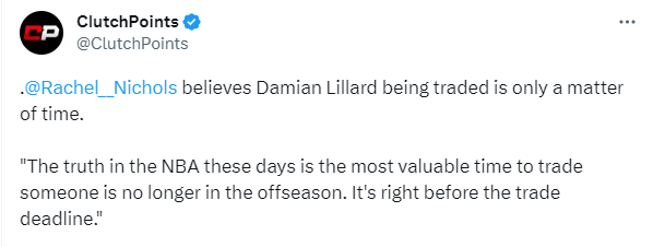 Rachel Nichols表示利拉德被交易只是时间问题,表示:如今NBA的事实是,交易某人(利拉德)最有价值的时间不再是在休赛期,而是在交易截止日期之前。
