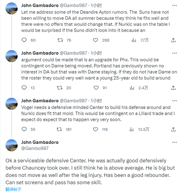 John Gambadoro发推谈到关于艾顿的交易流言,表示:“太阳整个夏天都不愿意交易艾顿,是因为艾顿很适合,而且没有任何报价可以改变这一点,但是如果努尔基奇出现在谈判桌上,我会很惊讶太阳队没有考虑这个问题。”