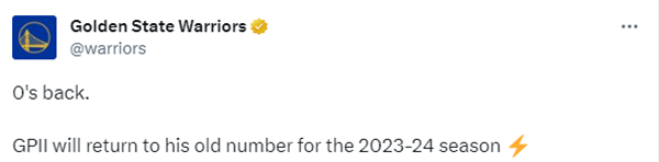 来源:JRS直播网09-22 15:56JRS直播网09月22日讯,勇士官方正式宣布,小佩顿新赛季将会穿回0号球衣,官推晒照并且写道:0号回归,小佩顿将在2023-24赛季穿回他的老号码。