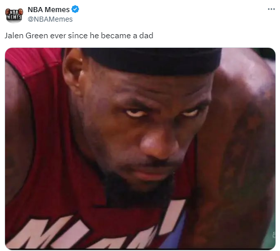 格林出色的表现引热议,美媒晒詹姆斯热火时期的死亡之瞳,配文写道:自从当爹后杰伦-格林就是这样;火箭官方盛赞格林的状态像火一样不可阻挡,并且把他评为全场最佳球员。