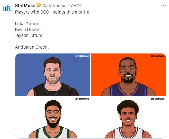 在3月份,杰伦-格林已经拿到306分,比肩杜兰特、塔图姆和东契奇成为本月仅有的4名总得分突破300+的球员之一。