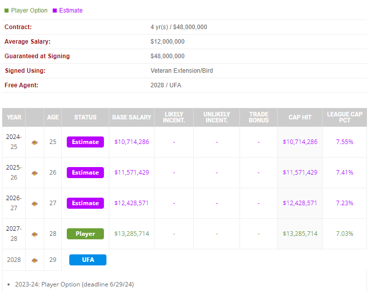 此前湖人和范德比尔特达成一份4年4800万美元的提前续约合同,近日,薪资网站Spotrac披露了范德比尔特这份新合同的细节——