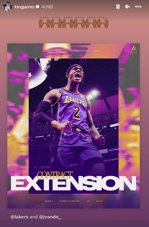 詹姆斯转发湖人续约范德比尔特的动态,配上双手赞同的表情祝贺队友。