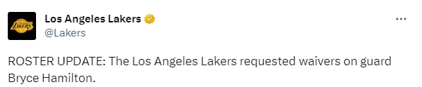 湖人正式裁掉布莱斯-汉密尔顿,他们双方于9月8日签下一份Exhibit 10训练营合同,可新赛季还没开始,汉密尔顿就被裁掉。